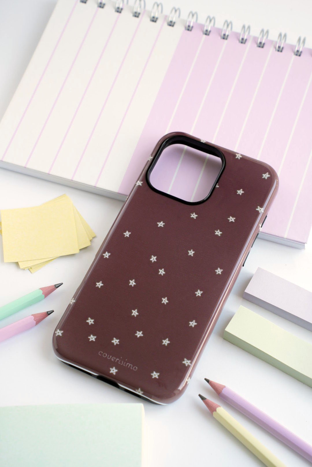 Telefonų dėklas rudos spalvos su baltomis žvaigždutėmis, padėtas ant balto paviršiaus, šalia pastelinių spalvų lipdukų, pieštukų ir užrašų knygelės su purpurinėmis linijomis.